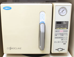 高圧蒸気滅菌器。主に金属、耐熱シリコン、ガーゼ、切削器具(ハンドピース類、バー類)などの滅菌に使用しています。